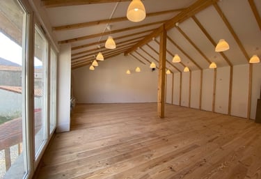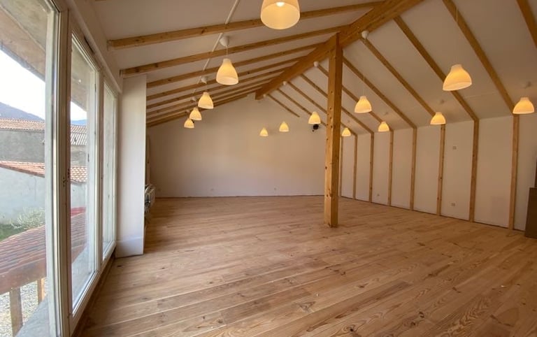 Salle de réception de 80m² pour vos événements, grands banquets (tables de réception sur place) ou cours collectifs pour des stages de yogas.