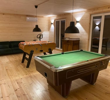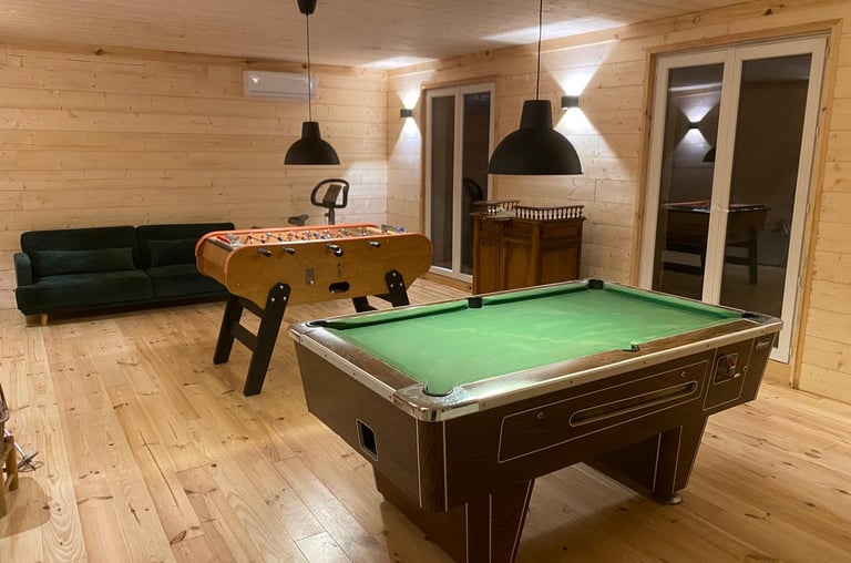 Une salle à manger pour un repas à 16 et plus, une salle de jeux avec Billard et baby-foot professionnels, un espace ludothèque pour les tous petits ou encore un salon cosy avec un foyer pour profiter d'un bon feu de bois.